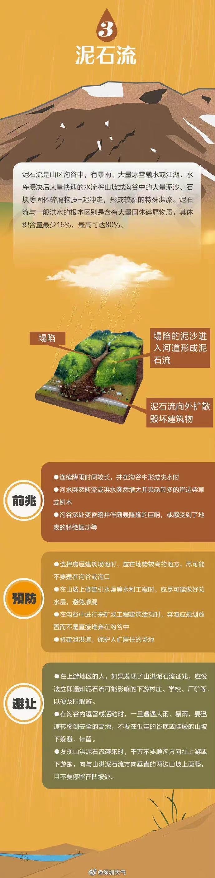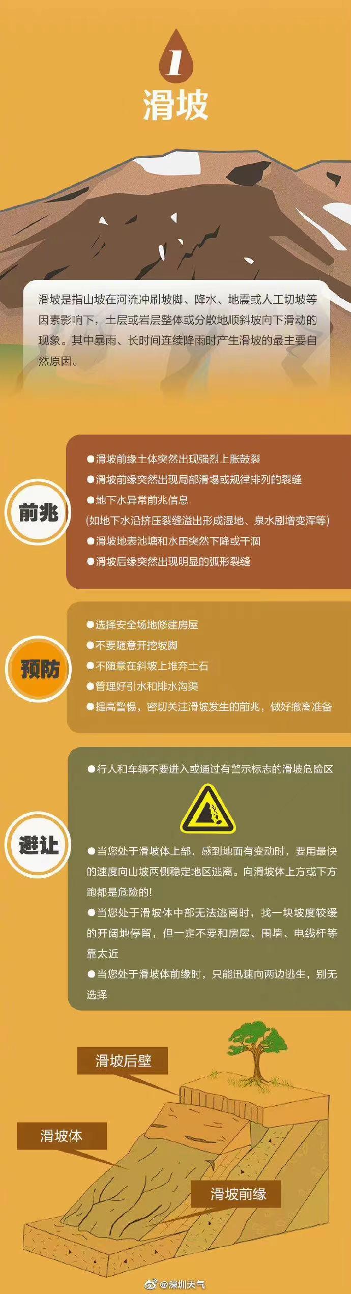 所以,深圳現(xiàn)已發(fā)布的地質災害氣象風險橙色預警,表示24小時內地質災害發(fā)生的風險高。其中地質災害主要包括滑坡、崩塌和泥石流等。
