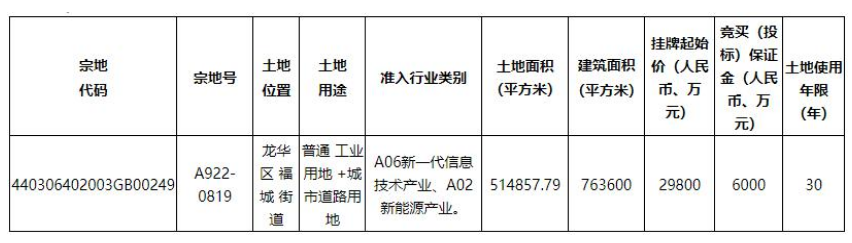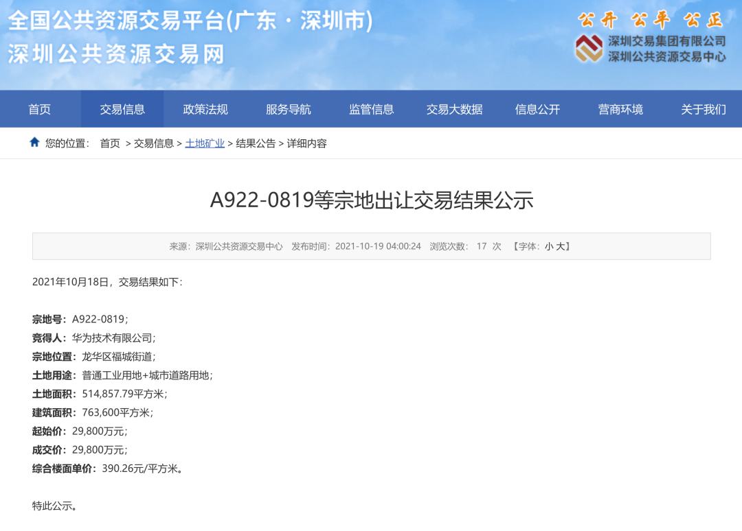 10月19日,據深圳公共資源交易中心網站顯示,華為以底價2.98億拿下位于龍華區的一塊普通工業用地,土地面積514857.79平方米,建筑面積763600平方米。相關信息顯示,該地塊用途為普通工業用地+城市道路用地,準入行業類別為A02新能源產業、A06新一代信息技術產業。