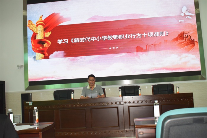 王劍勤副校長為全體教師深度解讀《新時代中小學教師職業行為十項準則》。王副校長要求全體教師要認真學習、貫徹、落實好準則精神,并以此為準則,規范教師職業行為,明確教師道德底線,維護教師職業形象,爭做新時代的“四有”好教師。