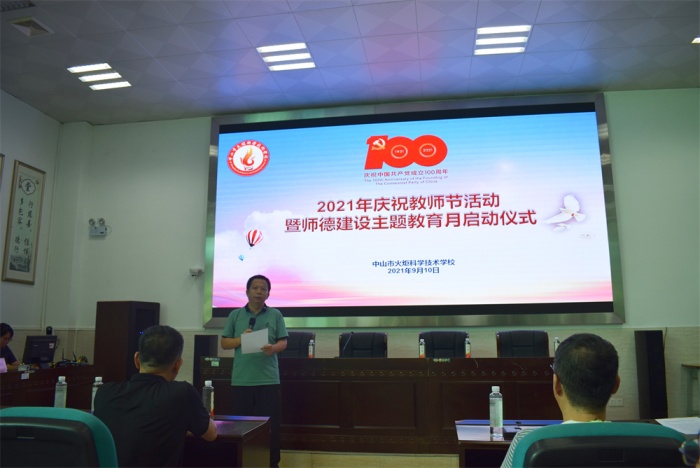 百年大計,教育為本;教育百端,師德為先。在第三十七個教師節到來之際,為進一步提升學校教師思想政治素質和師德師風水平,切實增強廣大教師教書育人的責任感和使命感,9月10日下午,中山市火炬科學技術學校在開發區校區報告廳隆重舉行2021年慶祝教師節活動暨師德建設主題教育月啟動儀式。活動由師資建設處廖江主任主持,開發區及南朗兩校區的教師共同參加了該活動。