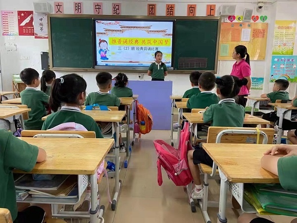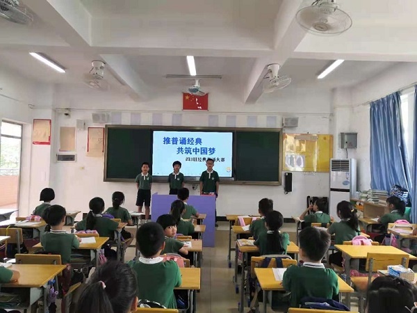 推普周里,五桂山學校一至六年級都開展了“推普誦經典,共筑中國夢”的經典誦讀大賽。一年級的同學童聲稚嫩,卻能瑯瑯上口誦讀著《大風歌》 《詠鵝》 《江南》等小學生必背的75首古詩,這也得益于學校一貫重視學生中華優秀傳統文化的培養與傳承。中高年級的同學們自信滿滿地背誦著自己喜愛的古詩。詩詞大會的舉辦,讓同學們領悟到了中華詩詞的獨特魅力,領略到華夏文化的博大精深。更明白了說好普通話的重要意義,關注了普通話的標準發音,更嚴格地要求自己說話字正腔圓,提高了語言表達的能力,更加熱愛祖國的文字。